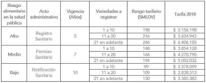 Asimismo, la Resolución 2674 de 2013 estableció que, dependiendo de tipo del riesgo, los productos alimenticios requieren de registro sanitario, permiso sanitario o notificación sanitaria, con sus correspondientes vigencias de la siguiente manera: